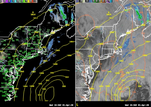 A storm system is currently spinning away to our south and has turned our winds locally into the NE. This has thrown quite a bit of moisture back at us and that process is only just starting. As the night progresses we will see this system start to really wind up and it will begin to perform a loop out at sea. As the storm loops through the day tomorrow it will throw clouds and rain back toward New England. The loop from the NAM12 model (shown below) demonstrates this process happening, at least in the mind of the model, pretty clearly.
