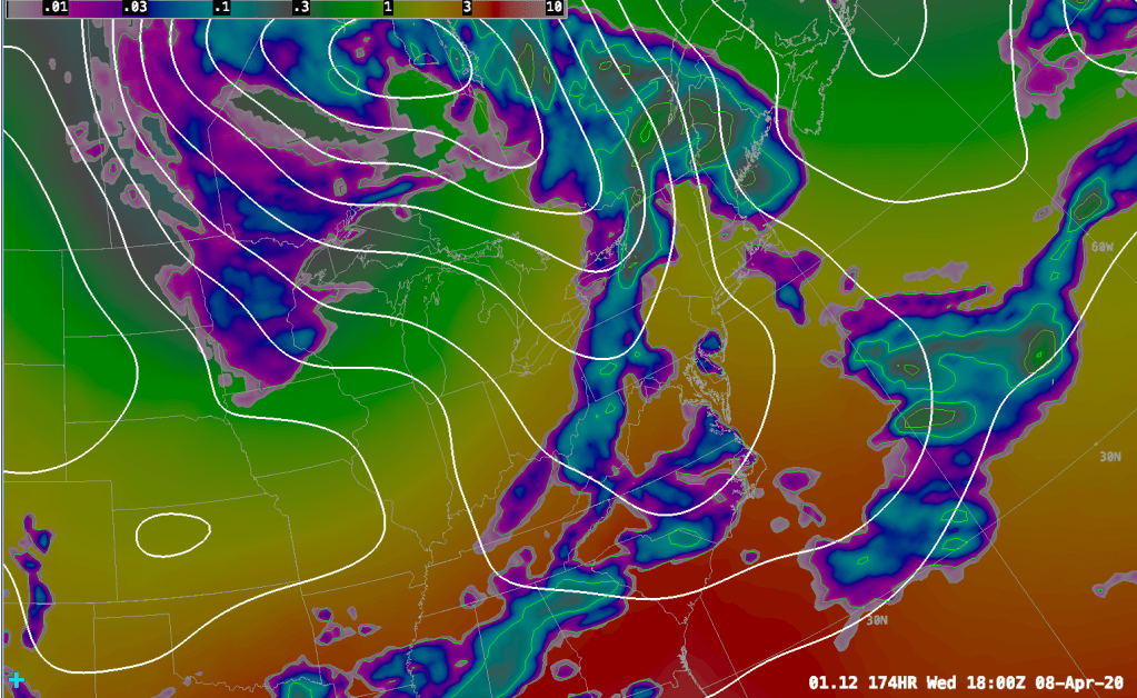 The other computer models GFS, European and Canadian models all support this idea of the low looping around. The overall pattern also supports this due to high latitude blocking around Greenland that continues to be the major weather feature on the global weather models. This feature is jamming up the upper level weather pattern and in turn storms near the surface also get caught in this atmospheric log jam.