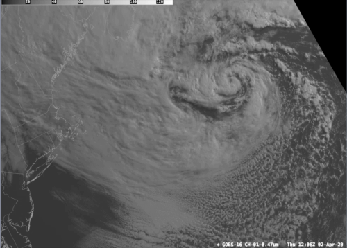 If you look carefully at the storm you can make out an eye like feature at its center. This is normally seen with hurricanes but it can also manifest in fairly intense mid-latitude cyclones. Observations indicate that this system has a central pressure below 980 mb. By comparison, Superstorm Sandy had a central pressure of 945.5 mb over Atlantic City when it made landfall back in 2012. So while this storm is a bit weaker it still packs quite a punch.