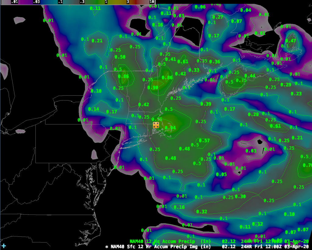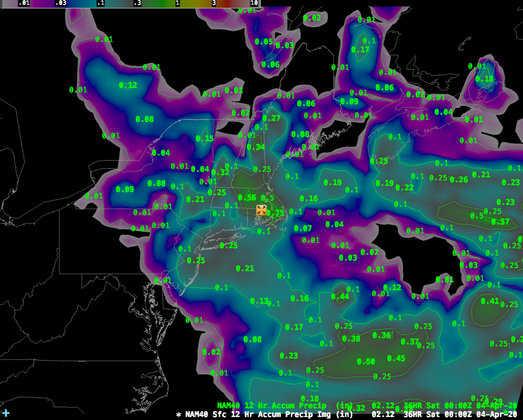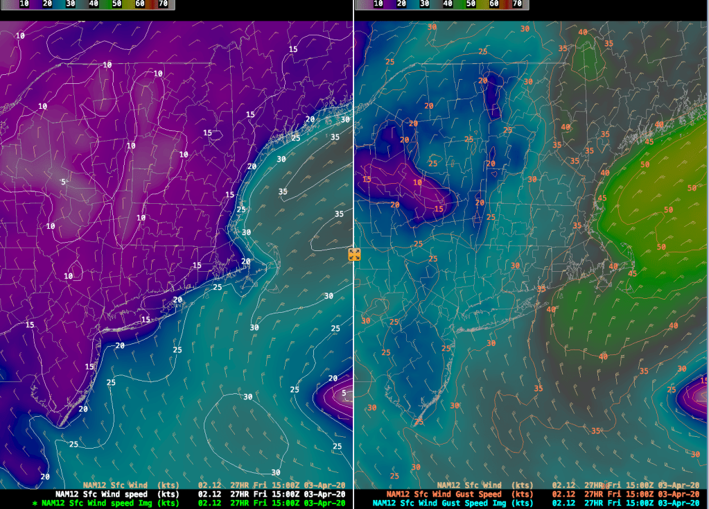 In addition to the wind, we are also going to get quite a bit of rainfall during the next 48 hours or so. The images above show the 12 hour rainfall amounts from the 40km NAM (NAM-40). The image on the left runs from 8pm tonight through 8am tomorrow morning and the image to the right shows total precipitation from 8am Friday – 8:00pm Friday. The totals over Boston add up to about 1.20″ of rainfall from 8pm tonight through 8pm Friday night. The GFS model shows about 1.30″ for the same time period so, all in all, we are looking at a pretty good soaking from this system on top of the wind. Great day to say socially distanced and indoors.