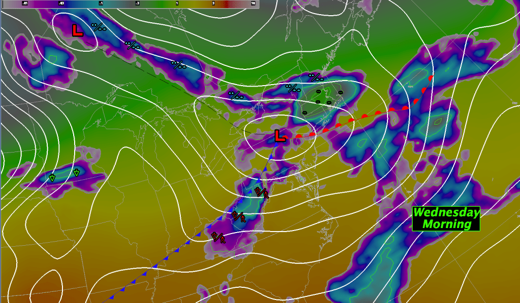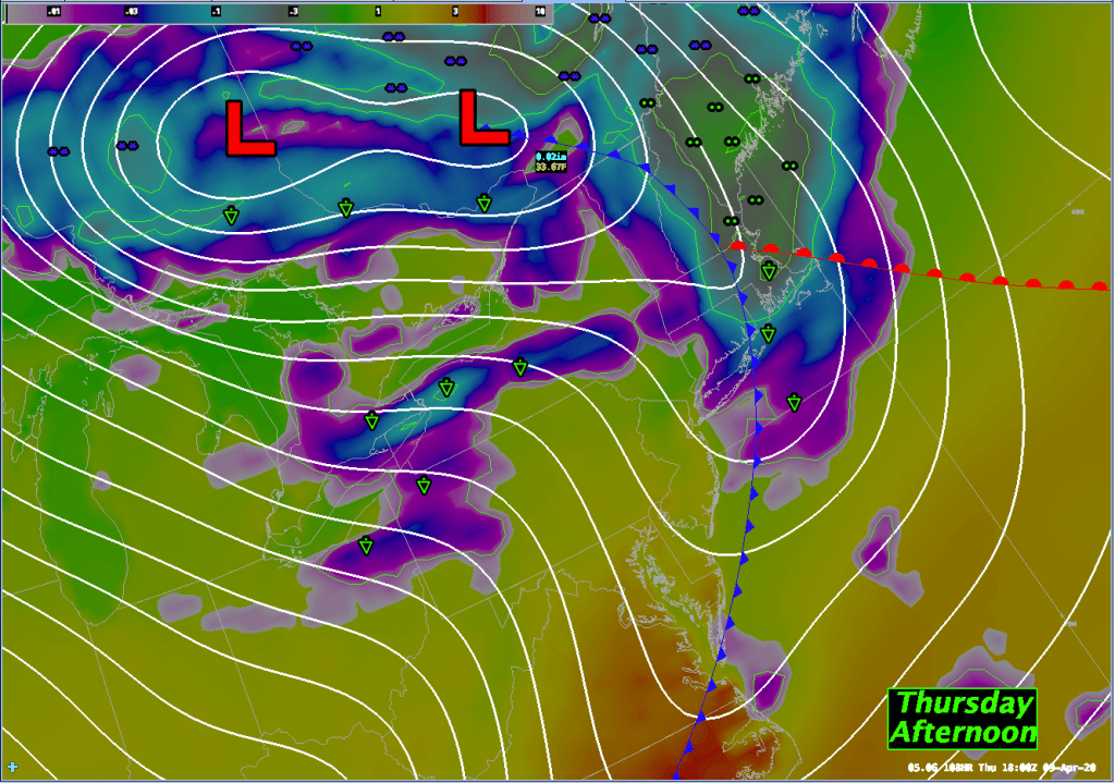 The next weather event will arrive quickly in the form of a cold front that will push into our area Thursday afternoon. The exact timing of the frontal passage isn’t 100% clear yet but I would favor slightly later in the afternoon over earlier but that will become clearer as the models lock on to this feature a little better. Either way it looks like we will see some showery weather for Thursday as this front moves through but it shouldn’t be a wash out by any means. .15-.25″ of rainfall in showers will be possible.