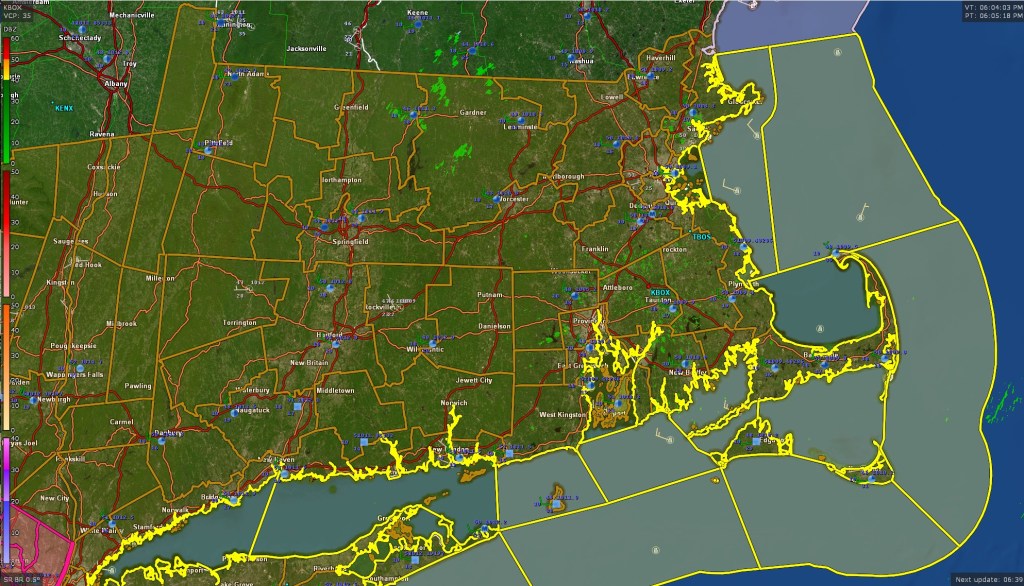 The map below is a map of the watches and warnings issued for Southern New England. The brown outlines which are shown all throughout MA/RI/CT and SE NY are High Wind Watches issued by the National Weather Service which have been hoisted for Monday morning through Monday evening. This high wind watch is being issued as a result of the storm that will impact our area on Monday with a rather heavy slug of rainfall. We are still anticipating at least 1.00″ of rainfall across much of eastern MA from around sunrise on Monday through sunset.