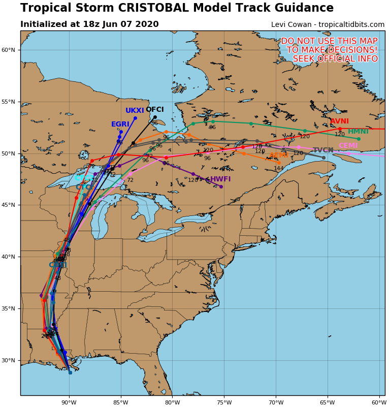 The guidance envelope seems to be tightly clustered on the location and timing of the arrival of Cristobal at the Louisana coast.