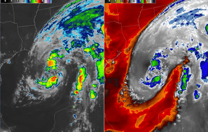 Satellite loops of Cristobal – Left: Infrared Image Right: Mid-level Water Vapor Image