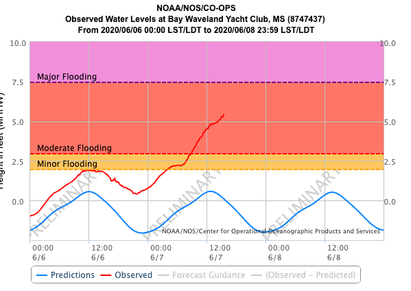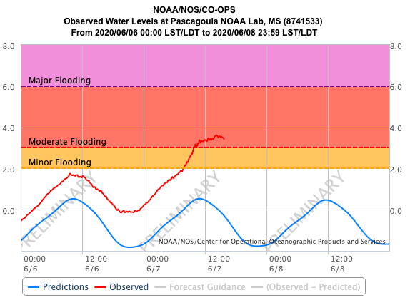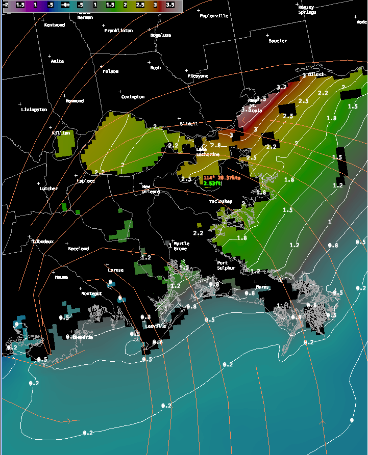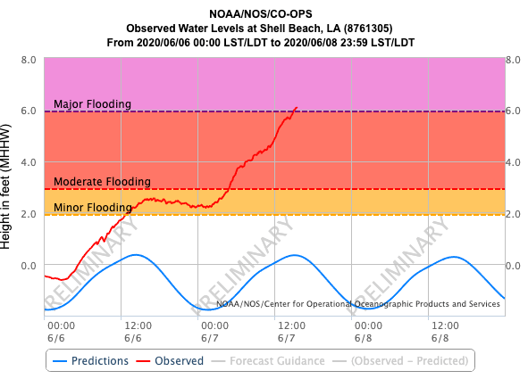 Some minor to moderate storm surge flooding is occuring at some stations along the LA and MS coasts. The worst station appears to be Shell Beach LA with a nearly 6′ storm surge occuring and the potential for major flooding in the area.