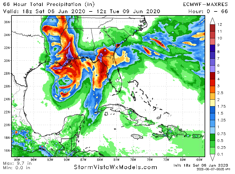RAINFALL: Excessive rainfall is likely with Cristobal. The models have been bouncing back and forth on where the bullseye of the heaviest rain will be. It appears that there will be a general area of 5-8″ of rainfall focused on the eastern portion of Louisana around New Orleans eastward to the MS/AL border. Locally higher amounts, up to 10″ may be possible within this area. There is significant flooding potential with this kind of rainfall.