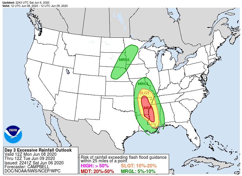 INLAND EFFECTS: Heavy rain will move inland after Cristobal comes ashore and vast swaths of the midsection of the country could see rainfall amounts in excess of 4″ especially from southern Mississippi through southern Missouri. The potential for flash flooding will be elevated throughout this area.