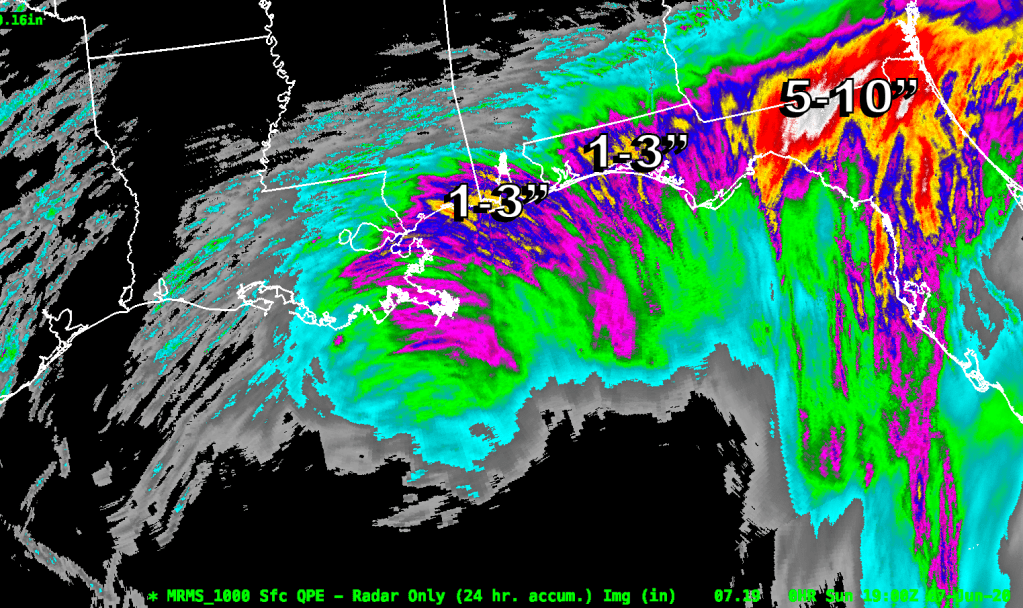 The next major threat area for heavy rain will be between New Orleans and the FL/AL border where there have been 1-3″ of rainfall thus far. Another 4-5″ of rainfall may fall in that area between now and Monday morning.