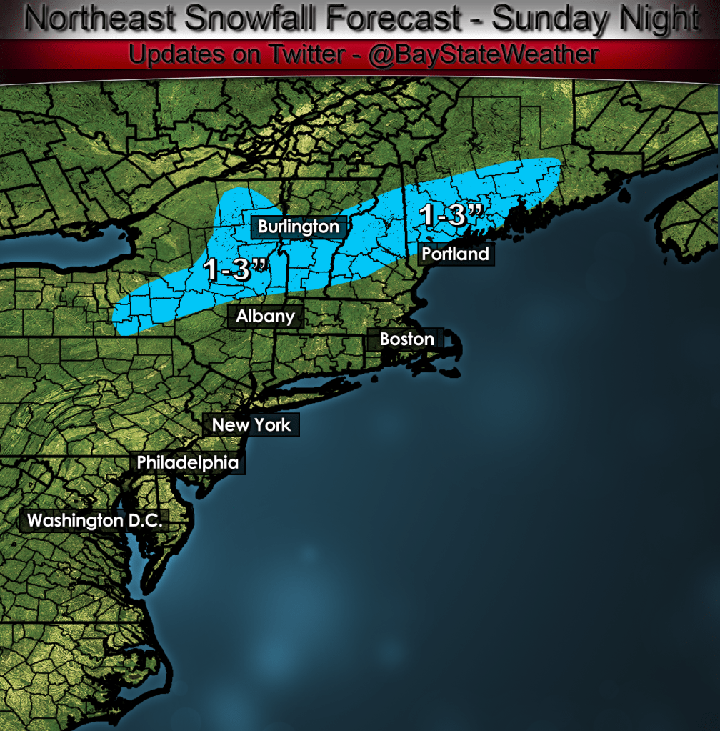After the sun goes down on Sunday temperatures look like they may cool off quite a bit across southern and central VT, central and northern NH and Maine. This cooling may allow any rainfall that remains in New England overnight Sunday into Monday to change to snow. Right now I’m thinking that 1-3″ of snow may be possible from southern VT northeastward into central NH into interior Maine.